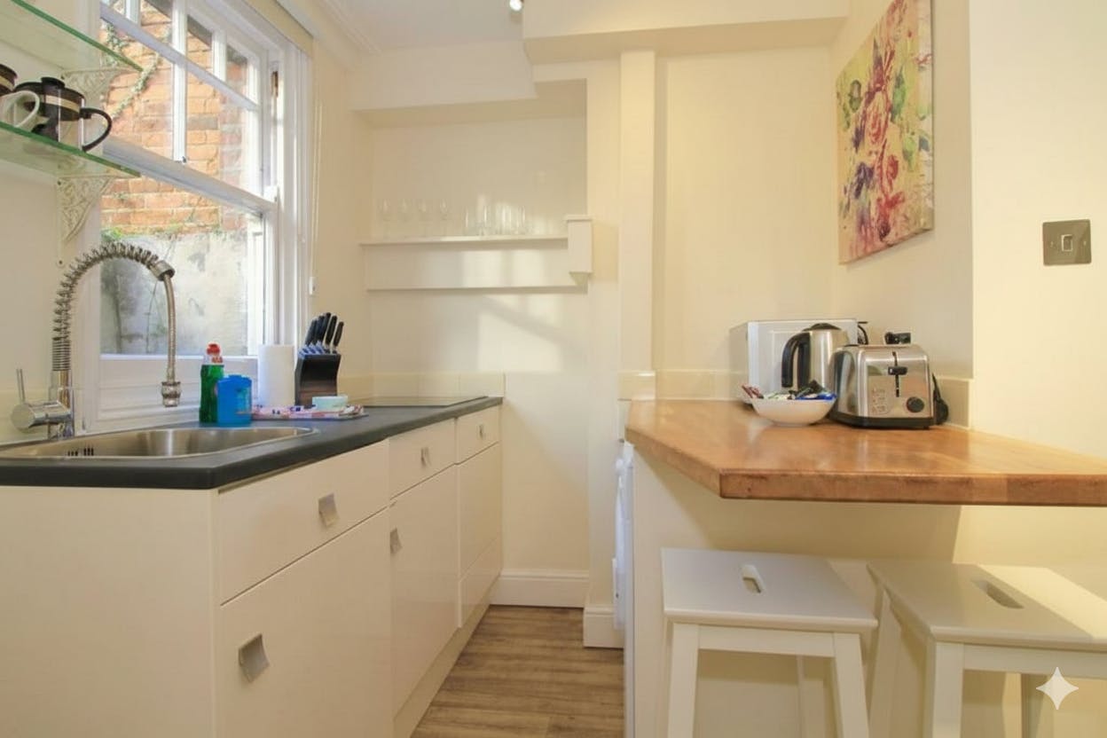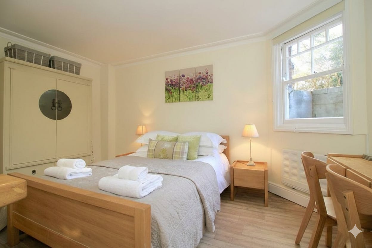 The One-Bedroom Basement Apartment (Lower Ground Floor) at Noa Residence offers a comfortable and private self-catering stay just minutes from Oxford city centre. This semi-basement apartment features a queen/double bed, a private bathroom with shower, hairdryer, complimentary toiletries, fresh towels, and linen. Guests can prepare meals in the fully equipped kitchen with a stovetop, refrigerator, microwave, toaster, electric kettle, and kitchenware. The apartment also includes a flat-screen TV, free high-speed Wi-Fi, washing machine, desk, wardrobe, dining area, and ironing facilities. With heating, fan, and thoughtful in-room amenities, this 161 sq ft apartment is ideal for solo travellers, couples, business guests, or academic visitors seeking affordable, modern accommodation in Oxford with comfort and independence.