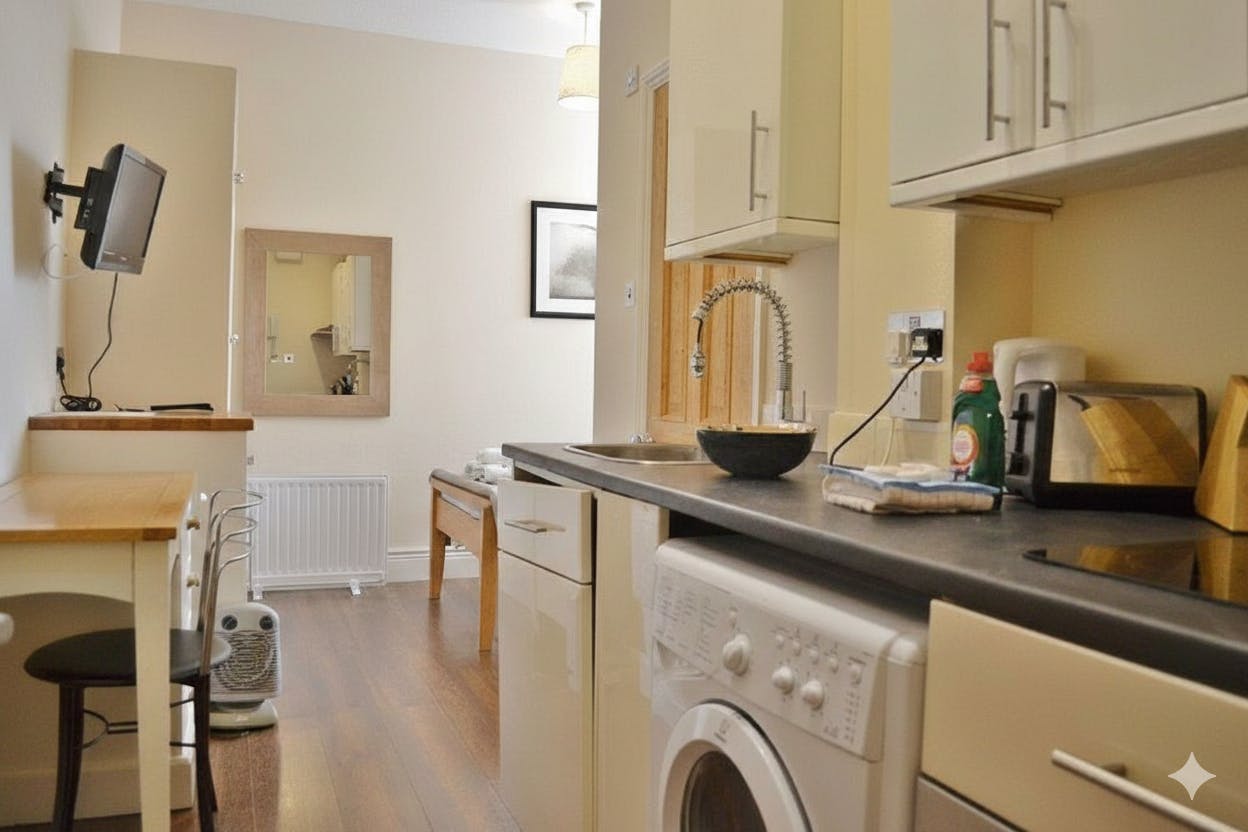 The Small Studio Apartment at Noa Residence is a comfortable and practical ground-floor studio designed for solo travellers seeking affordable, self-catering accommodation in Oxford. This single-occupancy studio features a twin bed, a private bathroom with shower, hairdryer, complimentary toiletries, fresh towels, and linen. Guests can prepare meals in the private kitchenette equipped with a stovetop, refrigerator, microwave, electric kettle, toaster, and kitchenware. The studio also includes a flat-screen TV, free high-speed Wi-Fi, washing machine, desk, sitting area, wardrobe, dining table, ironing facilities, heating, and a fan. Offering privacy, convenience, and modern amenities, this studio is ideal for short or extended stays close to Oxford city centre.